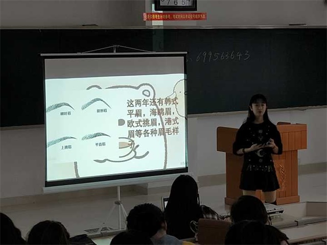 在此次讲座中,宋晨瑜从“妆面的构造”、“眼妆”、“眉毛”、“腮红”这四大方面给大家进行阐述。首先,她给大家讲述了化妆的基本顺序以及在各个步骤中所应注意的事项,其中,她重点给大家讲述了眼妆和眉毛。眼妆主要由眼影眼线睫毛组成。她讲:“不同眼影的搭配会组成不一样的风格,猎奇的撞色通常会有惊艳的效果,我们平时会通过角色的性格人设来描绘眼线,或者是眼影的颜色来搭配眼线,以及自身眼睛的样子自己的风格来搭配眼影眼线。在眉毛的讲述中,她讲到:“眉毛是五官之首,眉开生运,它的作用除了提升气质,让人变美,更是对深深影响人的运势和气势。因此在一个妆容中,眉毛非常重要。”随后,宋晨瑜和在场同学进行了互动,大家互相分享化妆心得,同时,宋晨瑜也给大家解答了一些同学们在化妆中遇到的问题与困惑,大家都受益匪浅。