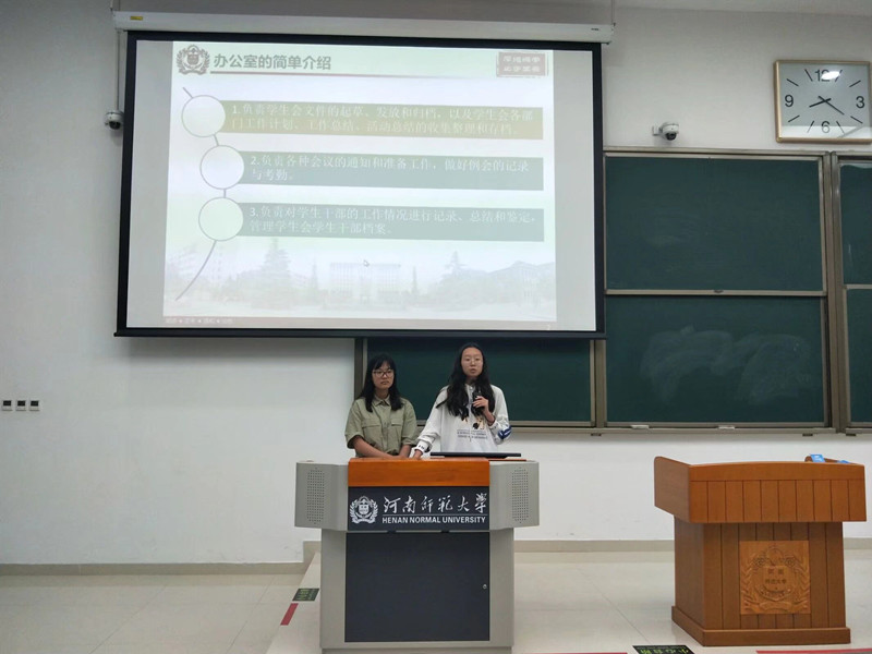 活动伊始,院学生会主席张紫懿寄语新生,讲述了自己在学生会的亲生经历和切身感受,鼓励大家加入团委或学生会给自己一个锻炼的机会,在服务学院师生的同时不断提升自身的综合素质。随后,团委的4个部门和学生会的9个部门按顺序一一进行部门介绍,从部门的人员、部门的职责、部门的招新要求三个方面详细地介绍本部门,各部门用生动有趣的语言,结合炫酷的PPT,给新生们视觉和听觉上的冲击,激起新生的好奇心。团委宣传部和融媒体中心利用部门特色,以抖音快闪的形式进行推介,文艺部部长和副部长更是唱跳结合进行宣传,场上掌声不断。会议最后,团委老师敦洁做总结,她强调:“团委和学生会要紧密结合,互帮互助,同时同学们要结合自身兴趣和个人优势,选择合适的部门。”