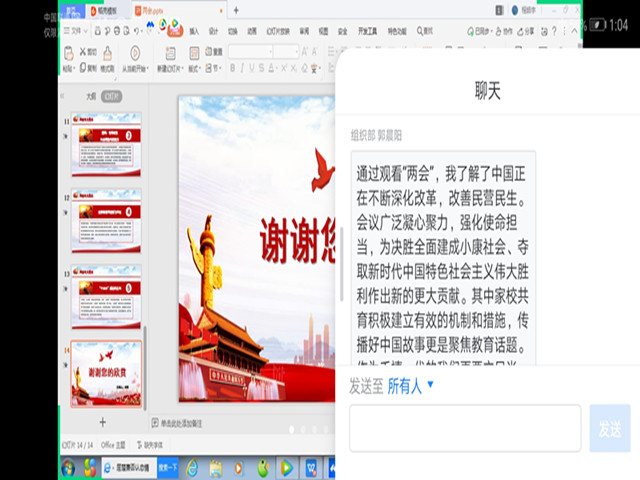 会议中,主持人程皓宇给大家梳理了“两会”的重大意义及精神实质等内容,从多个方面向大家介绍了此次两会的主要看点,并强调到,“两会的声音与当代大学生息息相关,作为一名新时代的青年,应当加强自身的历史使命感和责任感,对两会精神的学习应由被动转向主动。在个人学习、工作中深入贯彻落实两会精神。分析完两会的热点,主持人带领大家一起观看了“习近平总书记参加湖北代表团审议”的新闻片段,灾难渐渐远去,抗“疫”形式向好,“两会”适时召开,抗“疫”精神永在,在场成员有感而发,积极分享自己学习两会精神的心得体会,大家纷纷表示,作为一名大学生,一定会坚持原则,通过学习两会精神,把握时代命脉,了解国内外形势,明辨是非,认清大局,坚定立场,坚决拥护党中央和国家所做出的科学决策。
