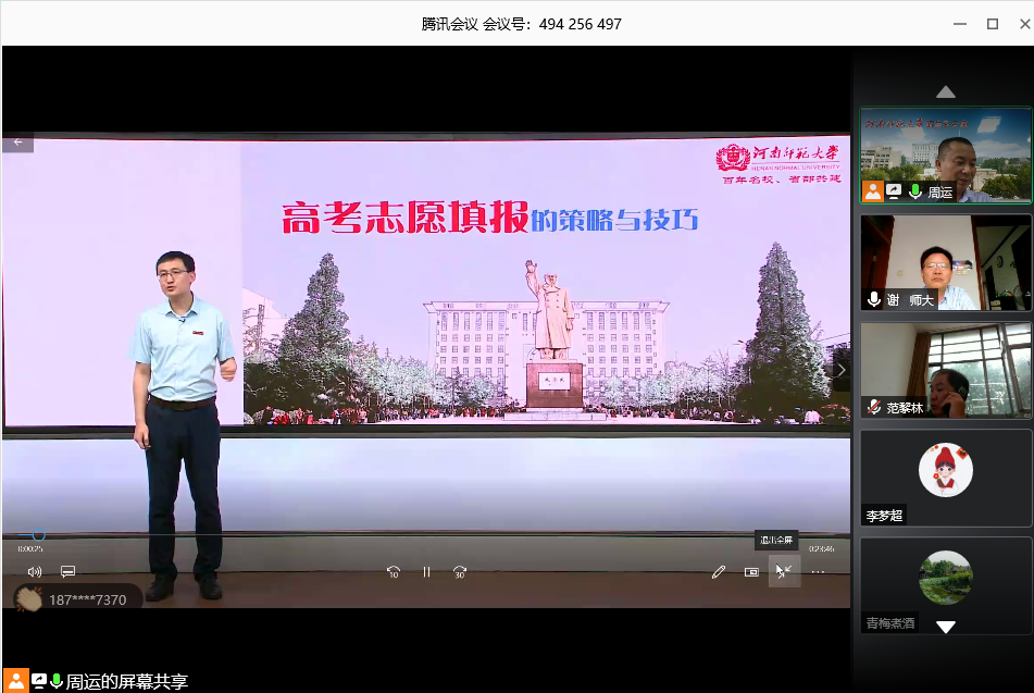 7月9日,计算机与信息工程学院招生宣传小组通过腾讯会议以直播的形式对信阳市潢川一中开展“教授、博士进中学”新高考咨询宣传活动。本次宣讲活动是学校2020年招生宣传第一站,校招生办公室副主任瞿洪明,计划管理科科长王艳军,计算机与信息工程学院党委书记谢华、副书记张东亮、副院长范黎林、宣讲组成员周运博士参加会议。