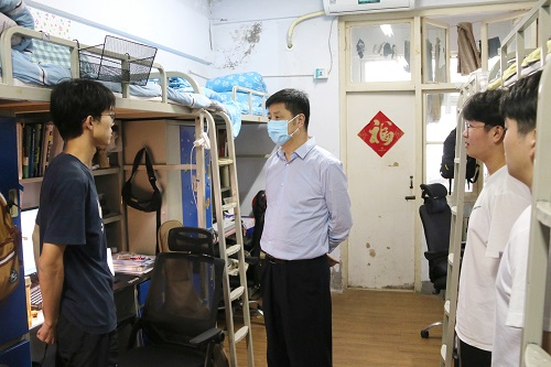 走访中,王宗敏查看了同学们的住宿环境,详细询问了同学们近期的思想、学习与生活情况,并围绕疫情防控政策、十一假期安排、宿舍生活条件、学校后勤服务保障等问题,认真听取同学们对学校工作的意见建议。交谈中,王宗敏勉励同学们要铭记历史,厚植爱国主义情怀,坚持中国共产党的领导,他通过讲述抗美援朝中国人民志愿军第50军的事迹,鼓励同学们立志报国,心系人民,奋勇拼搏,为实现中华民族伟大复兴不懈奋斗;要勤奋好学、打牢基础,主动了解掌握学科前沿和学科学术动态,积极参加学科竞赛,不断提升专业素养和创新实践能力,珍惜大学时光,做好学习规划,团结互助、相互激励,努力争创“学霸宿舍”;要树立大局意识、纪律意识,心怀集体、爱校荣校,遵守学校疫情防控规定,做好个人防护,积极配合学校共同守牢师大家园疫情防线。