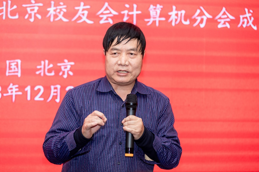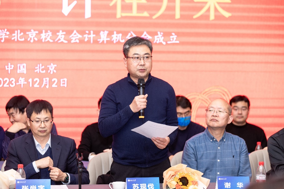 北京校友总会常务副会长兼秘书长李平原代表北京校友会进行发言。他对学校、学院对北京校友会计算机分会成立工作的支持表示感谢。他表示,分会的成立,旨在汇聚校友的智慧与资源,促进计算机领域的学术交流、助力学校科研成果转化和校友事业成长、服务北京社会经济发展,以实际行动为母校增光添彩。