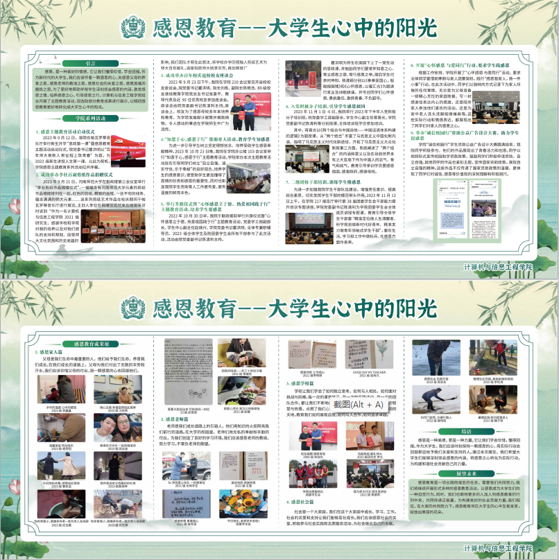 为加强对学生的思想引领、创新思想政治教育的途径与方法,帮助学生深刻领会感恩的内涵,激发感恩之情、培养感恩之心、引导感恩之行,我院举行感恩主题教育成果展,以展板、易拉宝、电子海报、微信公众号推文等多种形式,将学院前期开展的系列主题活动及成果进行展示总结及宣传。通过线上与线下相结合,营造育德和育心相结合的教育引导氛围。