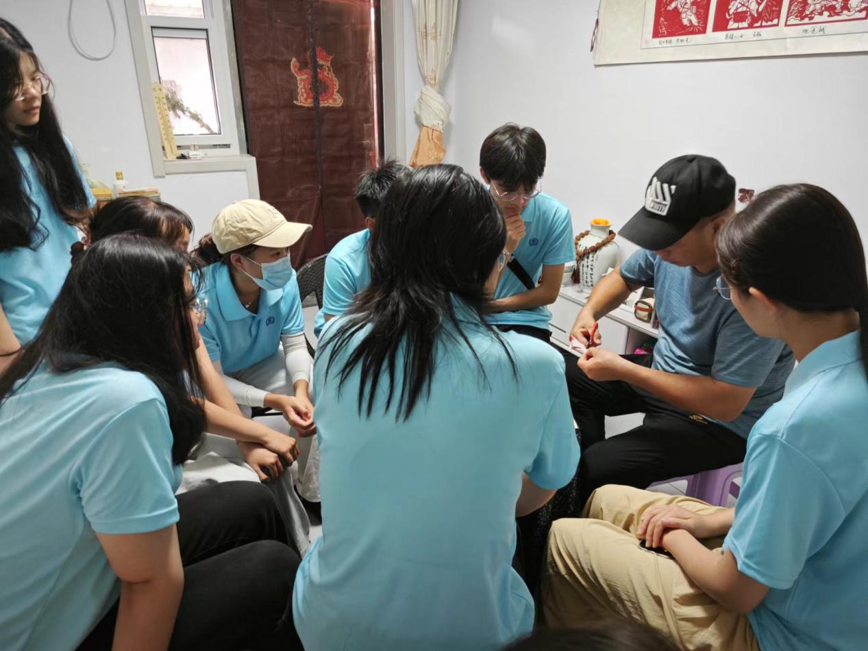 活动伊始,马利敏带领调研团队参观了他的工作室,介绍了他在工作室的日常工作以及工作室摆放的部分剪纸成品。他从最初的创作想法讲起,生动地讲解了他制作红色系列作品、梅兰竹菊系列作品以及八骏图的曲折过程。随后,他给调研团队成员们分享了一些简单巧妙的剪纸技艺并亲自指导调研团队的成员们现场练习剪纸技巧,他一边耐心地指导队员们怎么剪,一边介绍剪纸的基础形状——柳叶形,镰刀形,半圆形,云朵形等。在他的悉心指导下,队员们按照个人的创作思路自主设计窗花并成功剪了出来。最后马利敏将窗花样例和双喜字样例送给各位队员留作纪念,并寄语剪纸团队,希望大家能够真诚热爱剪纸文化,将剪纸文化继续传承下去!