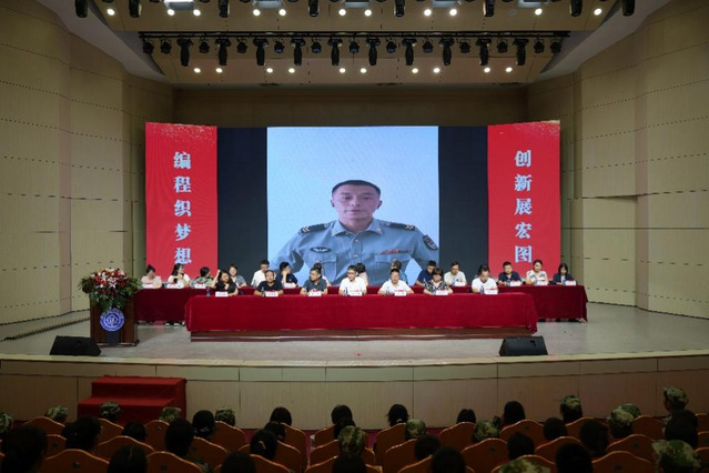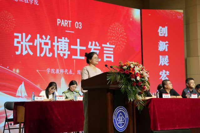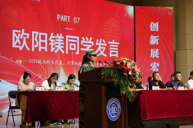 国家自然科学基金项目主持人张悦博士作为教师代表进行发言,她结合自身成长经历,围绕新生们可能会遇到的问题,语重心长地提出寄语,告诫大家要树立正确的学习观念,要明确专业目标,做好规划,要注重实践,提高综合素质,要严谨治学,诚信做人。获得中宣部“时代楷模”称号的“杨根思连”的根思尖兵郭孟祺作为校友代表进行发言,他向学弟学妹们介绍了“杨根思连”的三个不相信——不相信有完不成的任务,不相信有克服不了的困难,不相信有战胜不了的敌人。借此勉励学弟学妹们以激流勇进、披荆斩棘的奋斗姿态,以迎难而上、攻坚克难的血性担当,战胜一切困难,从一个胜利走向另一个胜利。
