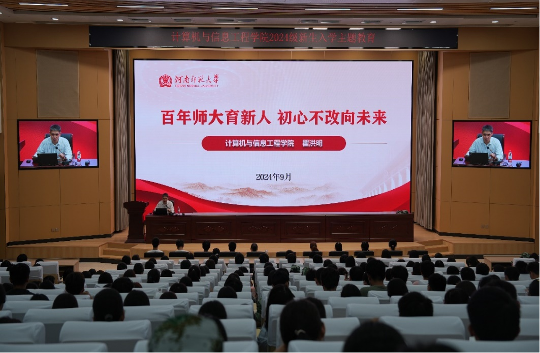 为了激励2024级新生在大学里以更加饱满的热情和坚定的信念投身到学习与实践中,计算机与信息工程学院于9月19日晚在综合实训楼五楼西报告厅为2024级新生举行了新生入学教育“思政第一课”,学院党委书记瞿洪明担任主讲,学院相关负责人、专兼职辅导员以及2024级全体学生参加聆听。