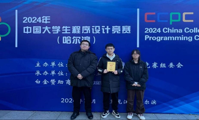 我院2022级本科生冯常林、徐熙涵、2023级本科生荆文超组成的“帕鲁小队”在第10届CCPC中国大学生程序设计竞赛(哈尔滨)中名列全国第109位,荣获铜奖,在第49届ICPC国际大学生程序设计竞赛亚洲区域赛(成都分站)中名列全国第98位,荣获铜奖。这两场比赛的冠军分别是2024ICPC全球总冠军北京大学呆呆鸟队和2023ICPC全球总冠军北京大学赤橙黄绿蓝紫队。