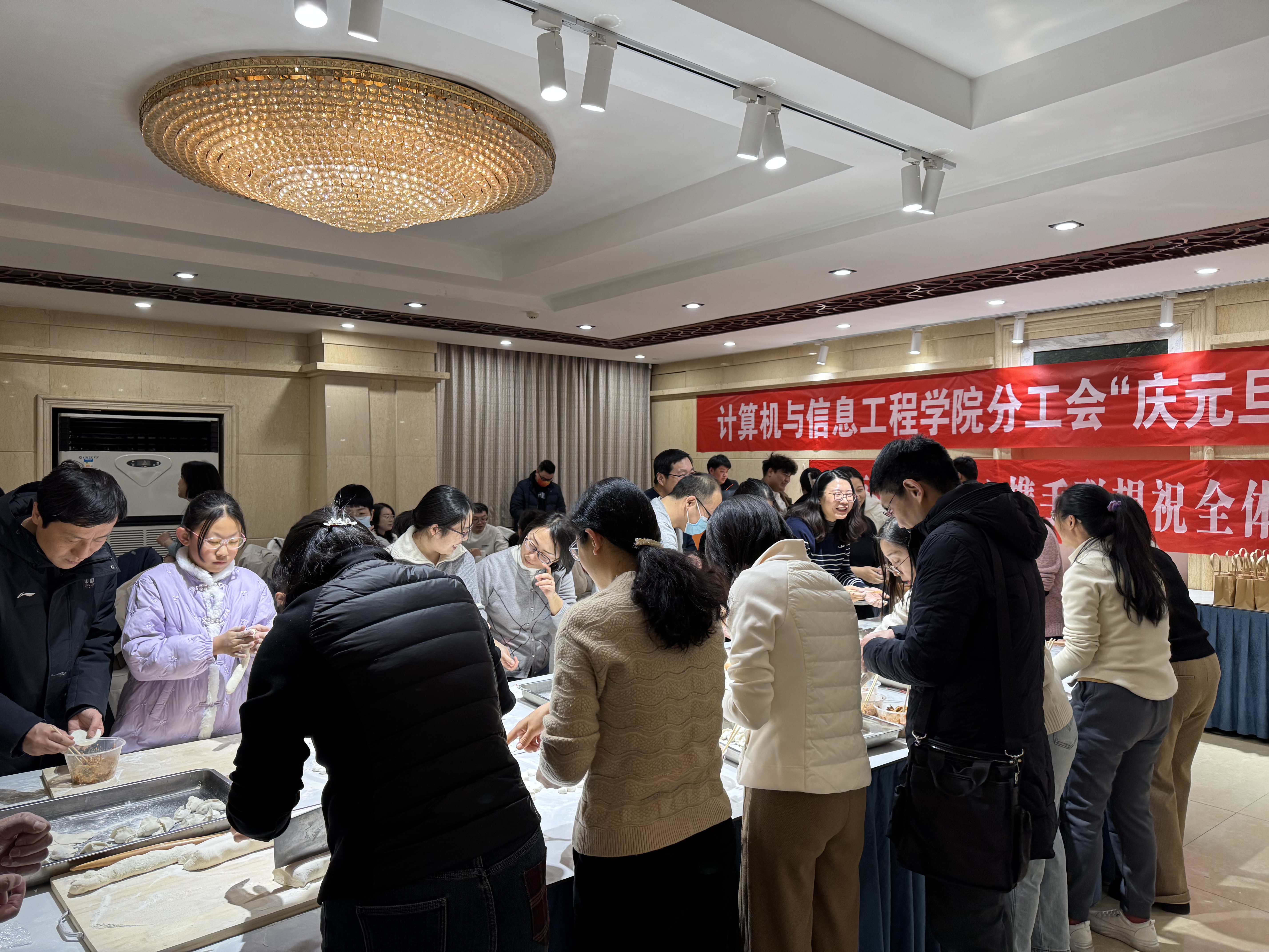 活动现场,内容丰富多彩,亮点频现。首先,交流环节以茶话会形式为教职工搭建了一个畅谈心声、分享感悟的舞台,大家纷纷回顾过去一年的工作与生活点滴,并对新的一年寄予了美好愿景与热切期盼。紧接着,信息技术产品体验区成为活动的热门焦点,教职工们亲身体验了学院最新的科研成果与信息技术产品,不仅深化了对学院科研成果的认知,更亲身感受到了科技进步带来的无限便捷与乐趣。尤为值得一提的是,活动中还特别增设了教职工包饺子环节,大家围坐一堂,亲手揉面、擀皮、包饺子,欢声笑语中传递着浓浓的温情与年味。这一环节不仅让大家在忙碌的工作之余享受到了动手制作的乐趣,更增进了同事间的友谊与团结。