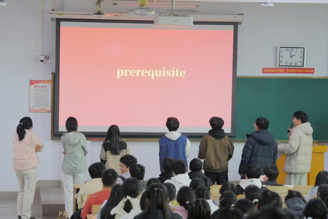 会议伊始,高分学生代表王季玥、魏冰旭、林依婷、陈怡轩依次登台,围绕时间规划、听力技巧、阅读策略与写作翻译等核心模块,结合备考实战经验与典型案例,系统解析各类题型应对方法,为同学们梳理高效复习路径,分享了自己的经验。在“四级迷惑行为大赏”环节,同学们踊跃提出备考困惑。2025级计算机科学与技术专业项子丰反映“单词认识却难解句意”的普遍问题,学姐们现场解析,强调长难句分析与核心词汇记忆的重要性。随后的团体挑战中,六名学生组成“救援小队”顺利完成词汇“解码”任务,将现场氛围推向高潮。在自由答疑环节,同学们围绕单词记忆、答题节奏等问题积极提问。针对2025级医学信息工程专业尹航提出的中英文单词对应记忆困难,学姐建议采用联想与拆分等方法提升效率。现场交流深入、反响热烈。