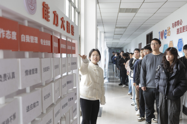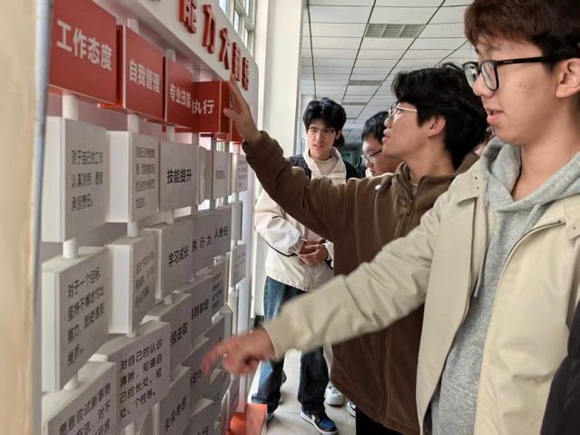 活动伊始,同学们在辅导员的引导下,先后参观了职美工作室和职心工作室。在职美工作室,侯梦瑶为同学们带来了精彩的MBTI人格类型讲解。她用生动浅显的语言阐述了16种人格类型的特征、优势以及潜在的职业倾向,让同学们对自身的性格特质、行为风格以及在团队中可能扮演的角色有了更为清晰的认识。“能力大翻转”体验环节巧妙设计了多种职场情境,刘怡琳通过引导同学们进行能力翻转游戏,提高了大家对“全局把握”“换位思考”“信息收集”等不同能力的掌握度。现场互动频频,反响热烈。2025级计算机科学与技术(创新实验班)专业的周武昊同学表示:“这次活动就像一面镜子,让我明白了各种能力在职场中的价值,也照出自身的短板和不足,对接下来的学习和工作都有很大的指导意义。”