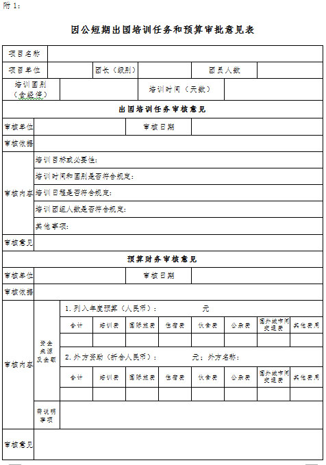 第七条各单位应当建立因公短期出国培训计划与预算管理的内部控制制度。组团单位应当填报《因公短期出国培训任务和预算审批意见表》,由出国培训管理部门和财务部门分别审核并出具审签意见,报经本单位领导办公会或党组(党委)审议确定。培训任务、培训费用预算审核未通过的,不得列入单位出国培训计划,不得安排出国培训。