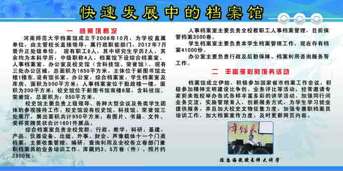 时值新中国63岁华诞和《档案法》颁布了25周年,为了总结过去,昭示未来,推动我校档案事业又好又快的发展,档案馆举办了系列宣传活动。