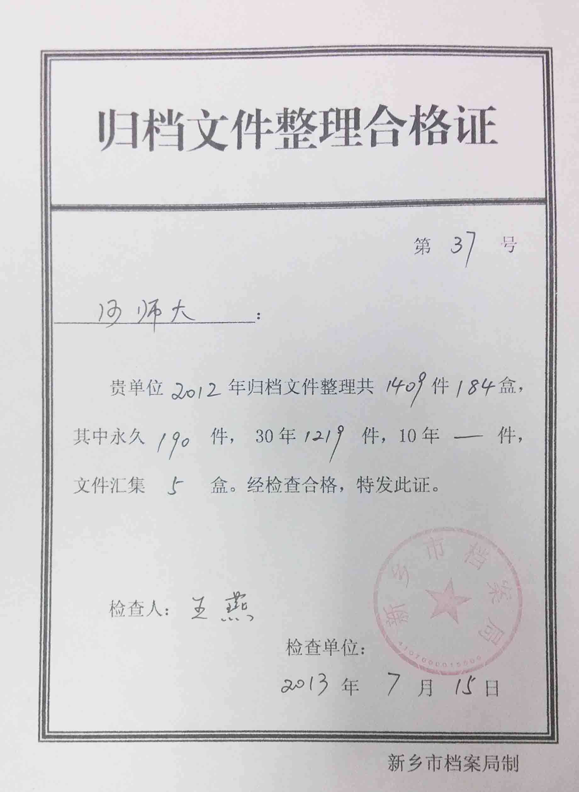 7月15日,伟德官网下载苹果版档案馆综合档案室获新乡市档案局颁发《归档文件整理合格证》。