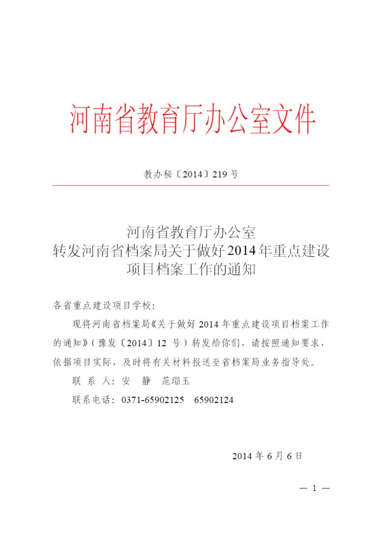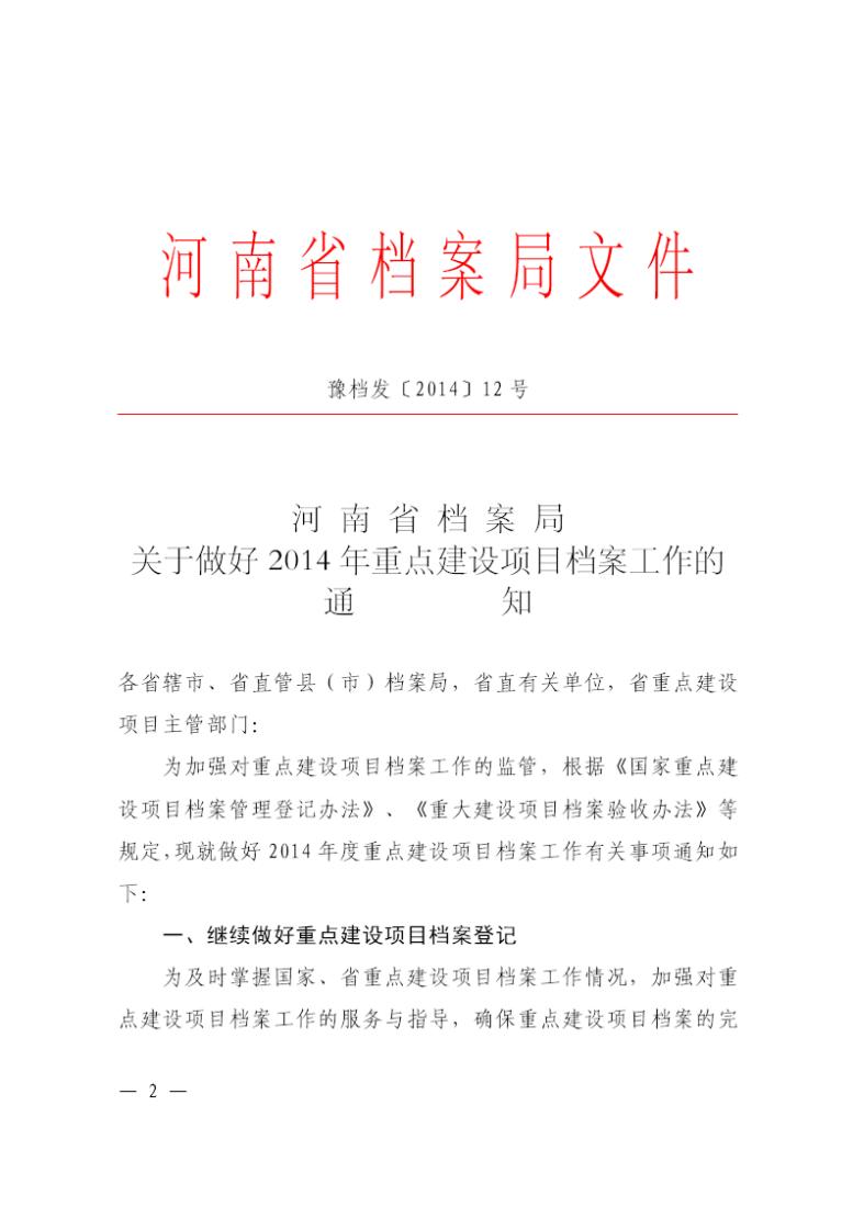 河南省教育厅办公室转发河南省档案局关于做好2014年重点建设项目档案工作的通知