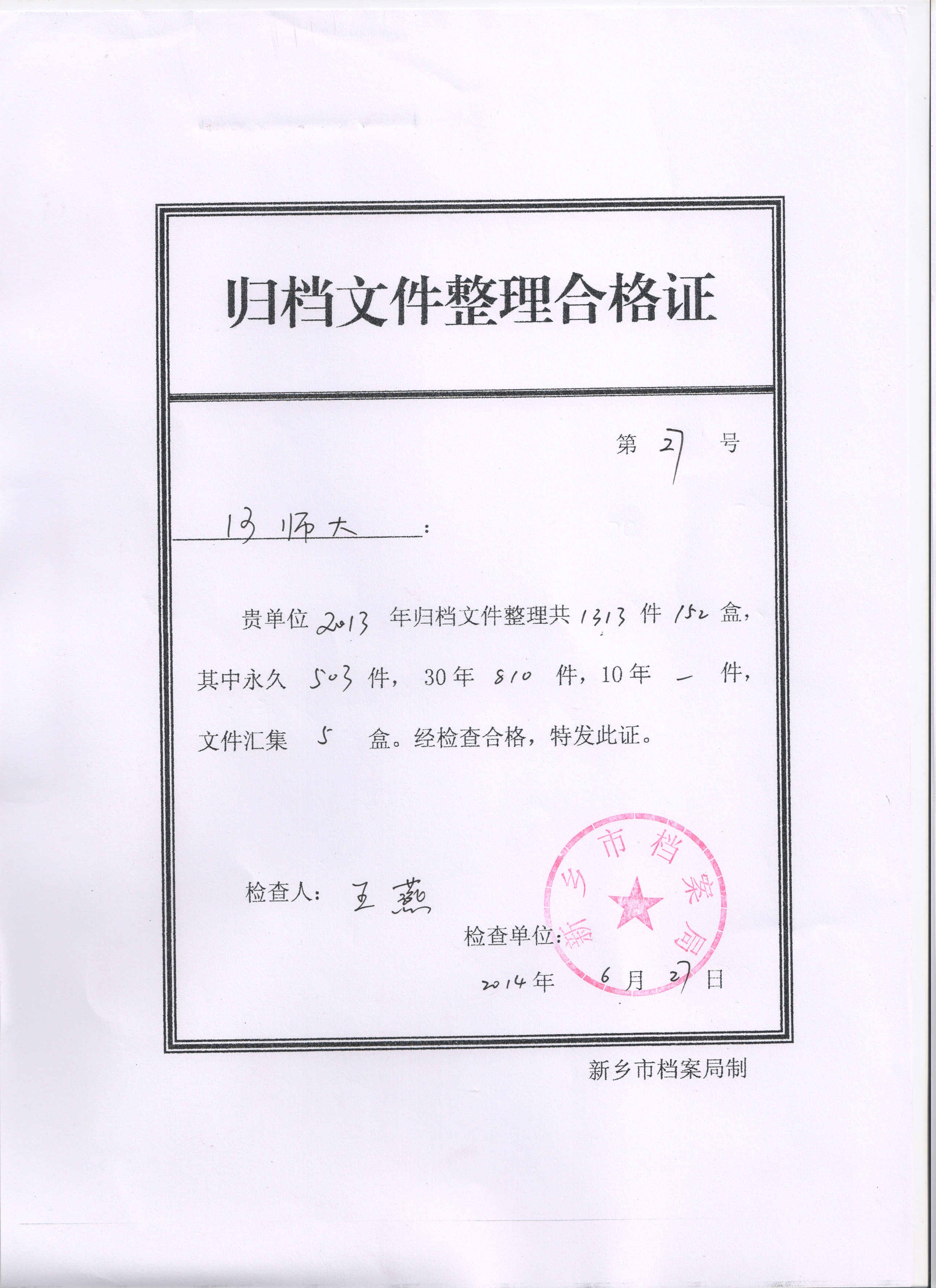 6月27日,伟德官网下载苹果版档案馆收集指导室获新乡市档案局颁发《归档文件整理合格证》。