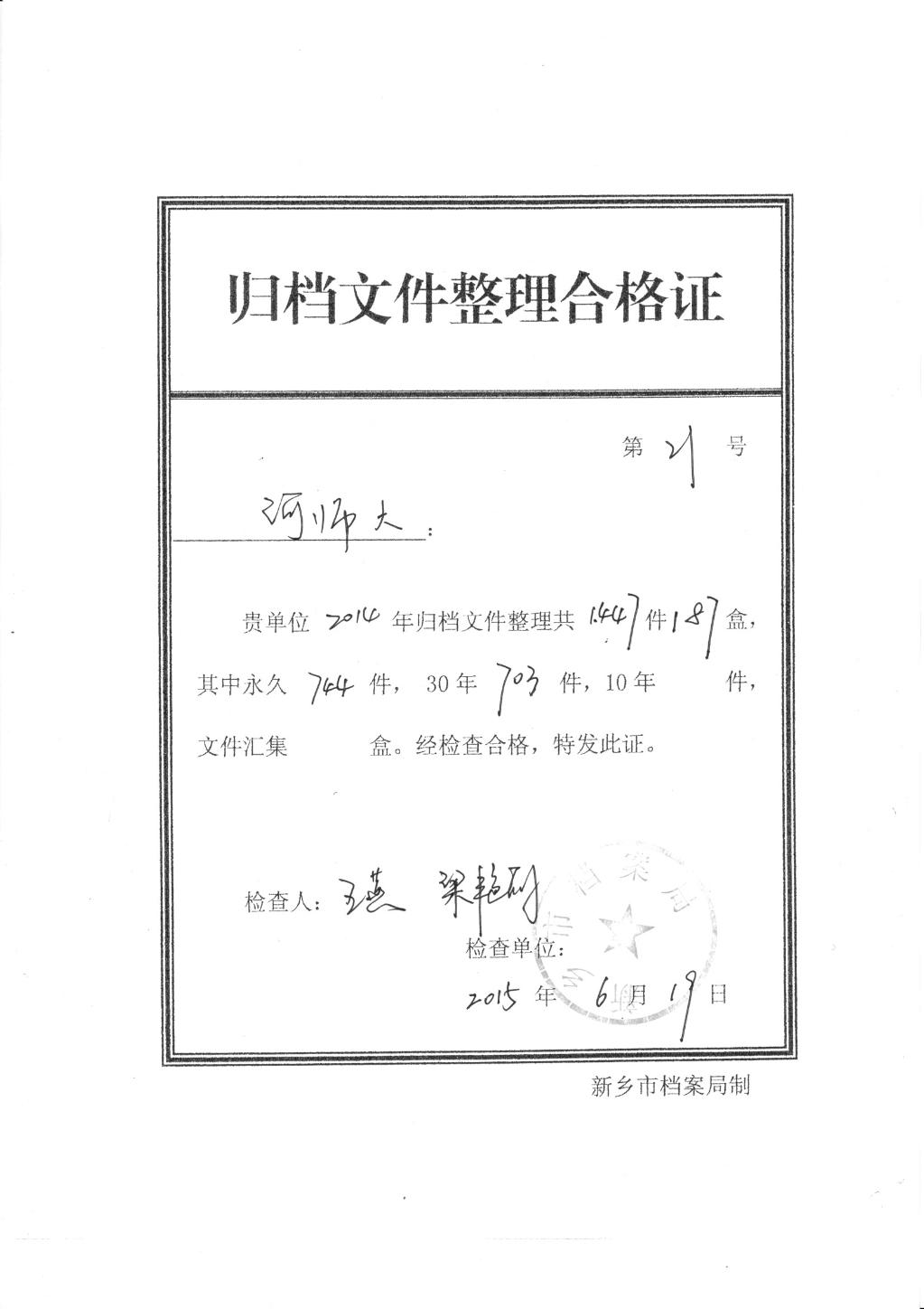 6月19日,伟德官网下载苹果版档案馆收集指导室、信息技术室获新乡市档案局颁发《归档文件整理合格证》。