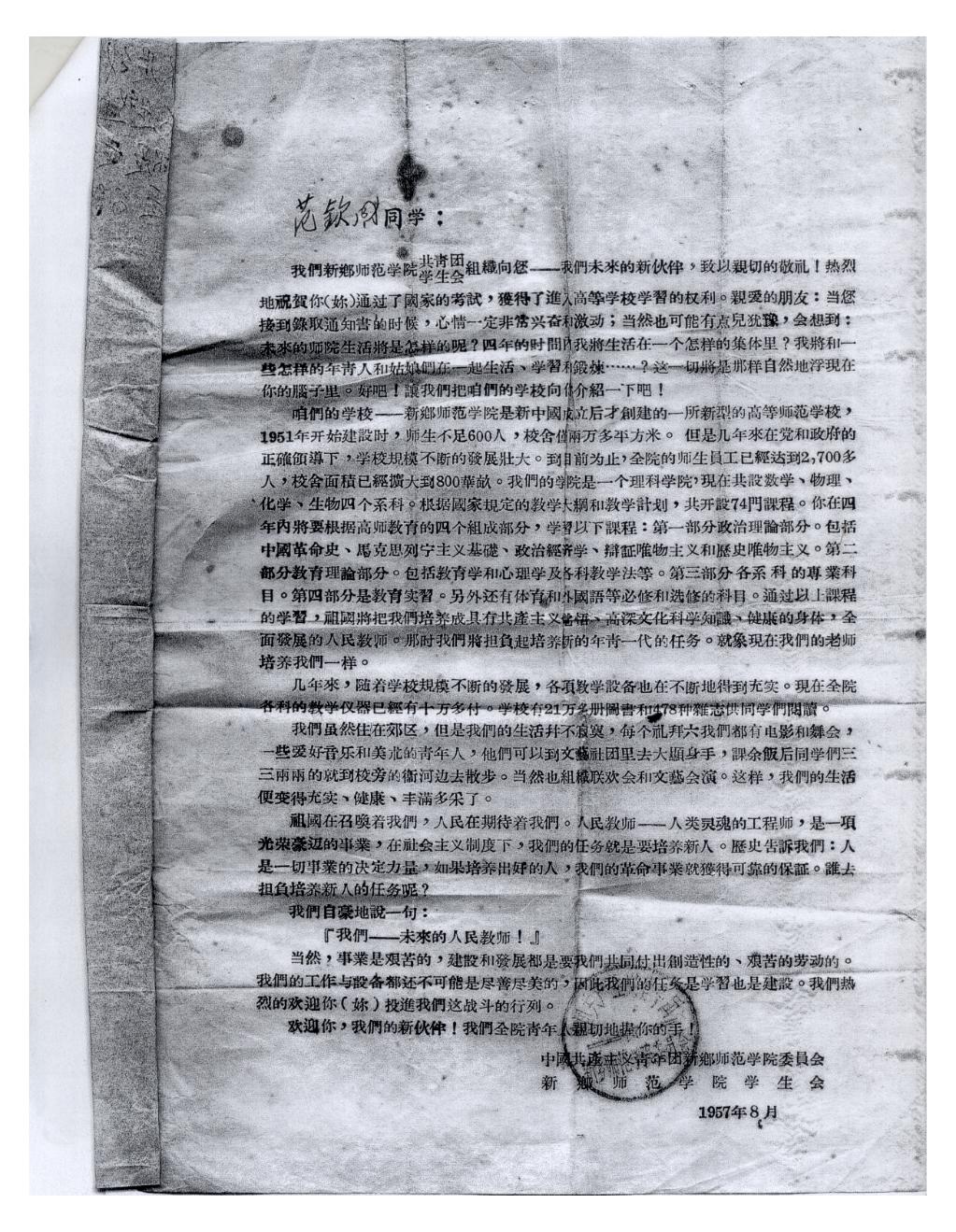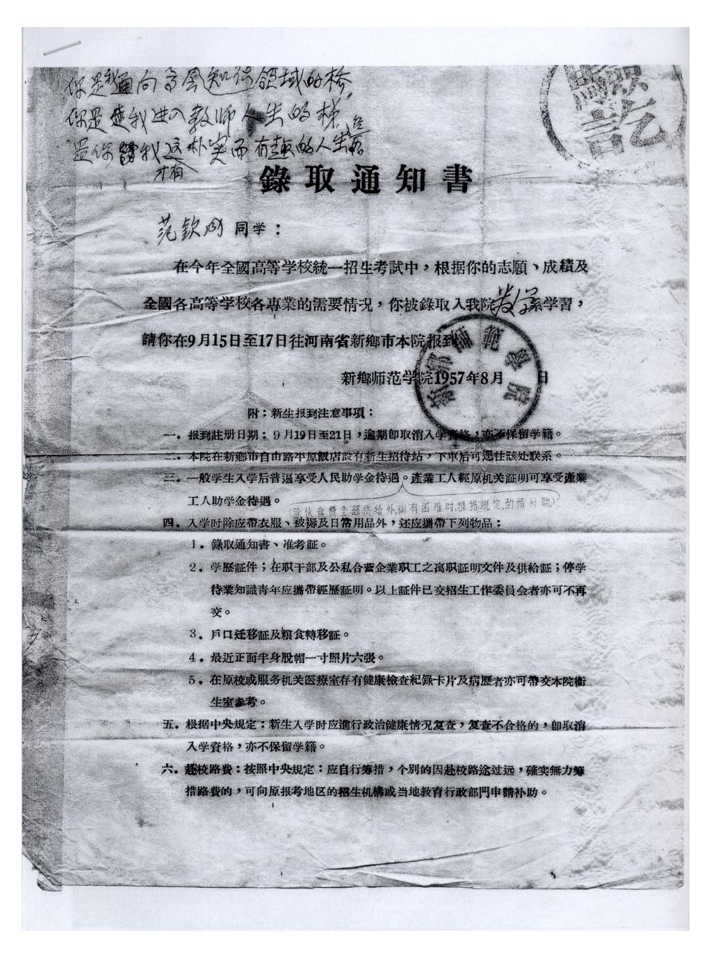 1957年新乡师范学院的录取通知书