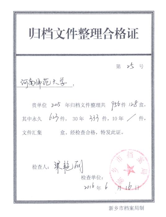 6月16日,伟德官网下载苹果版档案馆收集指导室、信息技术室获新乡市档案局颁发《归档文件整理合格证》。