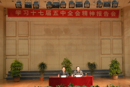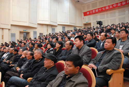 11月5日下午,我校学习十七届五中全会精神报告会在音乐厅举行。报告会由中央党校经济学部主任、博士生导师赵振华教授主讲。我校党委书记张亚伟主持报告会并讲话,校党委副书记王海旺,副校长王桂兰、王新生,全校处级以上党员干部及党员代表听取了报告。此次报告会是我校根据省委常委(扩大)会议精神和省委《关于认真学习贯彻党的十七届五中全会精神的通知》的要求,开展的学习宣传贯彻落实十七届五中全会精神系列活动中的一项。