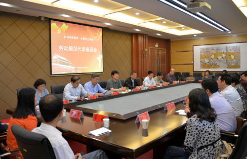 为深入学习贯彻习近平总书记4月28日在庆祝“五一”国际劳动节暨表彰全国劳动模范和先进工作者大会上的讲话精神,4月30日上午,我校在勤政楼第三会议室召开了以“弘扬劳模精神共圆师大梦想”为主题的劳动模范代表座谈会。校党委书记郑邦山出席座谈会并讲话。校党委副书记黑建敏,副校长孙先科、马治军,工会主席岳杰勇出席座谈会。来自全校各个单位的21名劳动模范、先进工作者代表和相关职能部门负责人等30余人参加了座谈会。座谈会由工会主席岳杰勇主持。
