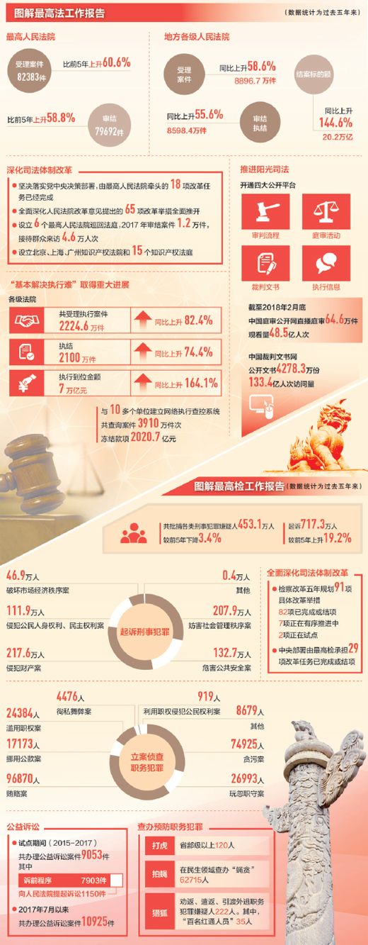 3月9日,十三届全国人大一次会议听取了最高人民法院院长周强所作的最高人民法院工作报告。过去5年,人民法院紧紧围绕“努力让人民群众在每一个司法案件中感受到公平正义”的工作目标,坚持司法为民、公正司法,审判质量效率、队伍素质能力和司法公信力不断提高。