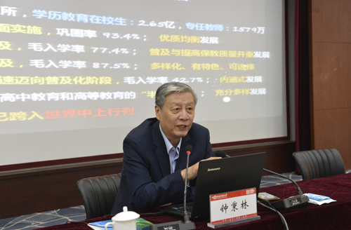 为进一步学习贯彻党的十九大精神,推动学校内涵式发展,5月3日下午,我校举行党委理论学习中心组(扩大)学习,中国教育学会会长钟秉林作专题辅导报告。报告会由校党委书记赵国祥主持。校党委理论学习中心组成员,副处级以上干部近300人听取了报告。