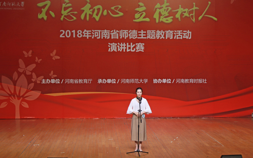 经过前期层层选拔,54名来自全省各地市的一线教育工作者参加了师德主题演讲比赛决赛。演讲比赛组长由河南教育新闻中心副主任、河南教育时报社总编辑刘肖担任,评委由校内外6位专家及我校学生组成的大学生评审团组成。在比赛现场,来自教学一线的老师们围绕“不忘初心 立德树人”这一活动主题,结合自身的经历进行了精彩演讲,表达了自己对教育事业的忠诚热爱和对争作党和人民满意的“四有好老师”的内心期盼。来自许昌市特殊教育学校的盲人教师郭朝阳以《用爱为盲孩子点亮一盏心灯》为题,讲述了自己多年来坚持手把手教授盲孩子们学习按摩等技能,让一批批盲孩子通过掌握一技之长树立自信心,内心重建对未来美好生活向往的感人事迹。来自郑州市管城回族区外国语小学的英语教师马东方以《青春无悔 为爱而行》为题,表达了自己为教育事业甘于奉献的初心和沿着教育道路不断前行的决心和信心。一天半的比赛中,在场观众用掌声表达了对基层一线中小学教师热爱教育、坚守责任的由衷敬意。同学们被参赛老师爱岗敬业、无私奉献、甘为人梯的品质深深打动,立志要以他们为榜样,努力学习师范生基本技能,不断提升自身素养,成为和他们一样优秀的人民教师。经过紧张激烈的比赛,普通教师组付越、特岗教师组郭雯琼等24名选手荣获一等奖,其余选手获得二等奖。