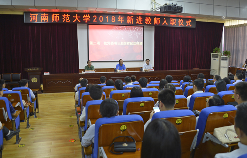 仪式上,赵国祥、臧振春、岳杰勇为新教师代表颁发工作证,佩戴校徽,意为新教师成为学校真正意义上的一员。40名学生代表为新教师献辞。化学化工学院张兴杰博士,荣获第四届全国高校青年教师教学竞赛一等奖、商学院青年教师周芳分别代表新老教师发言。人事处处长曹书文带领新教师进行入职宣誓。
