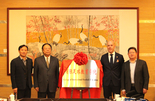 讲话结束后,李学志、吉斯•德容和北京水柔风文化发展有限公司董事长叶新萍共同签署了中荷足球青训基地建设合作备忘录。樊泽民、赵国祥、吉斯•德容、郭蔚蔚为我校国际足球教育学院揭牌。