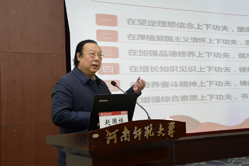 赵国祥要求广大教师一要在坚定理想信念上下功夫,塑造学生挺拔灵魂。理想信念是胜利之“匙”,是精神之“钙”,是思想的“总开关”。坚定理想信念,要做到以身示范、以例释理、由近及远、坚持不懈。二要在厚植爱国主义情怀上下功夫,激荡学生精神力量。厚植爱国主义情怀,要注重优化爱国主义情怀的内容与主题,注重对学生进行爱国主义情怀教育途径和方法的多元性。三要在加强品德修养上下功夫,筑牢学生价值基石。品德修养是中华民族的优秀传统,注重品德修养是教育的首要内容。加强品德修养要加强师德师风建设,促使学生习惯养成,让学生正视自己、改过迁善。四要在增长知识见识上下功夫,锤炼学生的真本领。增长知识见识,要教育引导学生珍惜学习时光,心无旁骛求知问学,拓宽知识广度深度,培养独立思考、创新思维。五要在培养奋斗精神上下功夫,铸就学生青春底色。培养学生奋斗精神,必须教育学生树立远大志向、培养坚定意志、克服消极思想。六要在增强综合素质上下功夫,书写学生精彩人生。综合素质是目前教育存在的缺陷和困境,是发达国家教育的先进经验,反映了经济社会对未来人才的需求。培养学生综合素质,必须德才并重、知行并重、补齐短板。