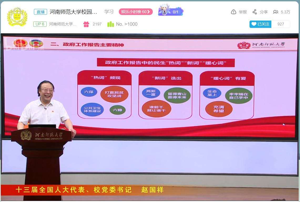 各基层党委、党总支、直属党支部积极组织本单位师生员工通过中国移动“和”直播,哔哩哔哩平台收看了本场宣讲会,并开展了热烈的线上学习讨论活动。其中,移动“和”直播最高观看人数达1.3万人,哔哩哔哩平台最高收看人数达5.3万人。