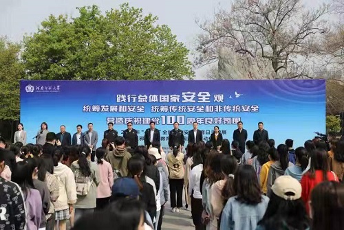 “国安才能国治,治国必先治安。”4月15日,在第六个全民国家安全教育日到来之际,我校在西校区校训石广场举行2021年“4·15”全民国家安全教育日主题展暨反邪教宣传教育进校园活动启动仪式。新乡市公安局副局长刘跃江、校党委副书记陈广文出席活动并讲话,新乡市公安局、牧野公安分局和我校相关职能部门负责人及师生代表共400余人参加活动。活动由校党委稳定办公室主任秦法跃主持。