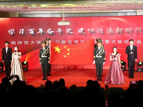 颁奖典礼通过歌曲《少年》、情景辩论《辩以明法》、情景剧《曼曼求索》、剪影画《御洪》及合唱《我的祖国》等一系列精彩的节目传递了炽热的爱国情,表达了在新的一百年征程中不断推进法治建设的坚定决心,生动地展现出了青年学子的蓬勃朝气。