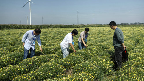 受9月份持续阴雨天气影响,安阳县部分即将进入采收期的药用菊花面临田间湿度过大、根系发育受阻、病害风险上升等突出问题,给药用菊花稳产提质带来严峻挑战。为切实降低不利气候对菊花生产的影响,助力企业科学应对、减损增效,2025年9月28日,河南省中药材(安阳县)产业科技特派员服务团(以下简称“服务团”)在团长赵喜亭的带领下,赴安阳县博宇农业有限公司菊花种植基地开展实地调研与应急技术服务。服务团成员王添乐、丁义峰等一同参加。