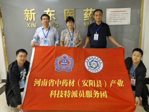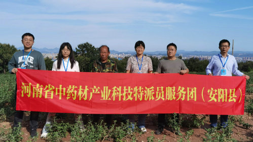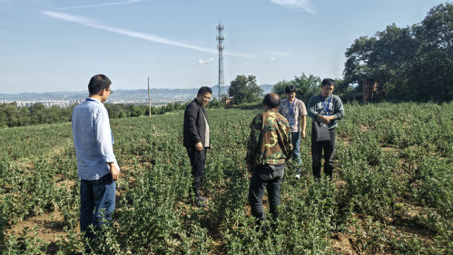 2025年10月04日,河南省中药材(安阳县)产业科技特派员服务团(以下简称“服务团”)团长赵喜亭带领成员王添乐、丁义峰等,在安阳县科技局陈有斐主任的陪同下,赴河南新东医药科技有限公司怀菊花种植基地开展科技服务,实地调研怀菊花种植情况,并针对当前生产中的技术难题提供解决方案与精准指导。