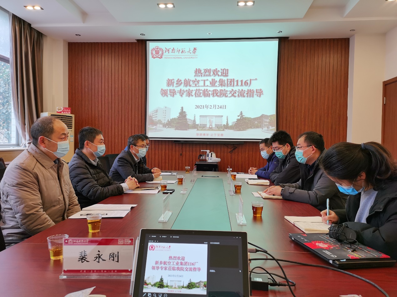 2月24日上午,新乡航空工业集团116厂研发中心主任李磊一行莅临我院交流洽谈技术开发合作。交流会在数学楼207举行,院党委书记姜良、副院长黄广月、信息与计算科学系主任崔鲁宾、李钧涛教授、郑燏涛博士和科研秘书裴永刚参加。