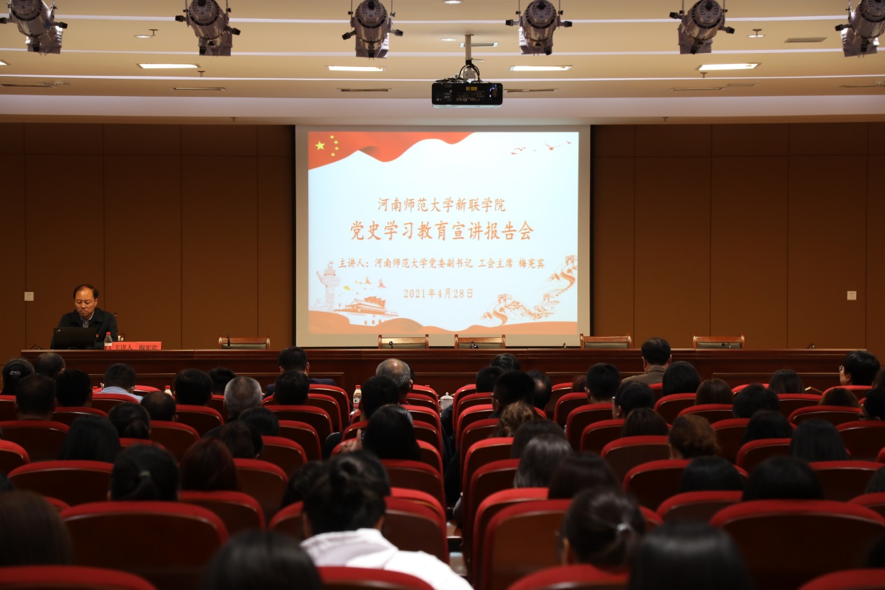 为推动党史学习教育深入基层、深入群众、深入人心,4月28日下午,校党委副书记、工会主席梅宪宾在平原湖校区为新联学院师生作党史学习教育专题宣讲。新联学院党政领导、全体教职工和学生代表参加学习。宣讲报告会由新联学院党委书记李浩主持。