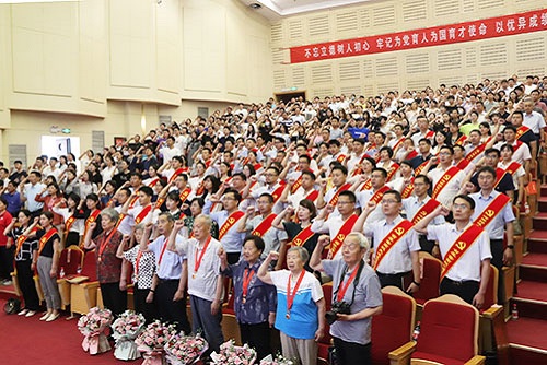 表彰大会在雄壮的国歌中开始。陈广文宣读“光荣在党50年”党员名单,全校共有132名党龄满50年的老党员荣获纪念章。赵国祥和常俊标为10位“光荣在党50年”老党员代表颁发纪念章,少先队员为老党员代表敬献鲜花。