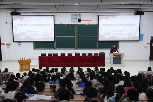 张壬从“制度优势,根本保证”“铭记历史,坚定初心”“大灾大难,淬炼担当”和“勤奋求知,砥砺青春”四个方面展开讲解。在“制度优势,根本保证”这一部分,张壬讲述了中国共产党百年间的发展历史,并鼓励学生们要把党的历史学习好、总结好,把党的经验传承好、发扬好。他以近期“河南疫情防控”和“郑州7.20特大暴雨洪水”两件事情为例,系统地阐释了“坚持党的集中统一领导”“密切联系群众”以及“集中力量办大事”三个方面的制度优势。在讲述“大灾大难,淬炼担当”时,张壬结合师大师生积极应对汛情的生动事迹,让在场学生们近距离地感受了灾难面前我校学子的优秀表现,他强调青年学生要把灾难当成教材,与祖国共成长。活动最后,他对在场学生提出了三点希望,鼓励学生们要“强信念,做新时代奋斗者”,“增本领,做新时代引领者”,“勇担当,做新时代奉献者”。