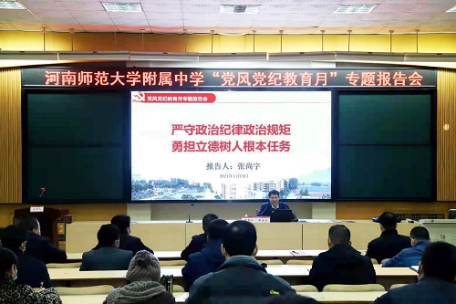 按照2021年党风党纪教育月活动安排,11月9日,校党委常委、纪委书记、监察专员张尚字到师大附中作党风党纪教育专题报告。师大附中领导班子成员、中层干部、党支部书记及年级主任参加了会议。报告会由师大附中党委书记谢友海主持。