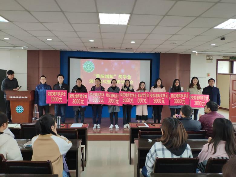 “荣院增辉”奖学金是学院2003届校友赵艳辉先生为资助学院学生报考本院研究生,提升学院研究生招生质量而专门设立的,目前已资助报考和录取学生170余人次,资助金额达20万元。该奖学金的设立激励了同学们更加积极地进行科研为学院的立德树人、选才育人工作树立了榜样,更好地激励同学们全面发展,为国家、民族、社会贡献青春力量。