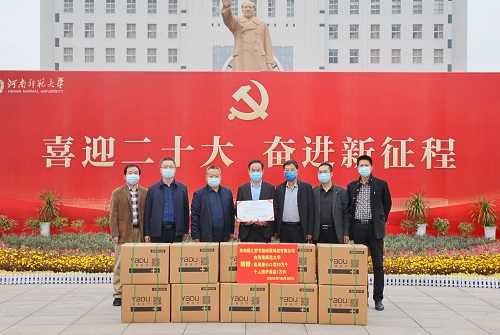 10月29日下午,郑州绿之野节能环保科技有限公司向我校捐赠防疫物资仪式在图书馆前广场举行。校党委常委、副校长聂国兴,郑州绿之野节能环保科技有限公司总经理蔡统富,校党政办、疫情防控前线指挥部、校友与基金工作办公室和后勤管理处等部门负责人出席捐赠仪式。