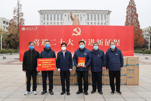 11月28日下午,河南省豫矿新能源有限公司向我校捐赠防疫物资,捐赠仪式在图书馆前广场举行。河南省豫矿新能源有限公司向我校后勤保障人员定向捐赠医用外科口罩5万只、热水器1台,助力我校防疫工作。校党委常委、副校长刘玉芳,河南省豫矿新能源有限公司驻师大项目部负责人石磊,校友与基金工作办公室和后勤管理处等部门负责人出席捐赠仪式。捐赠仪式由校友与基金工作办公室主任苏现伐主持。
