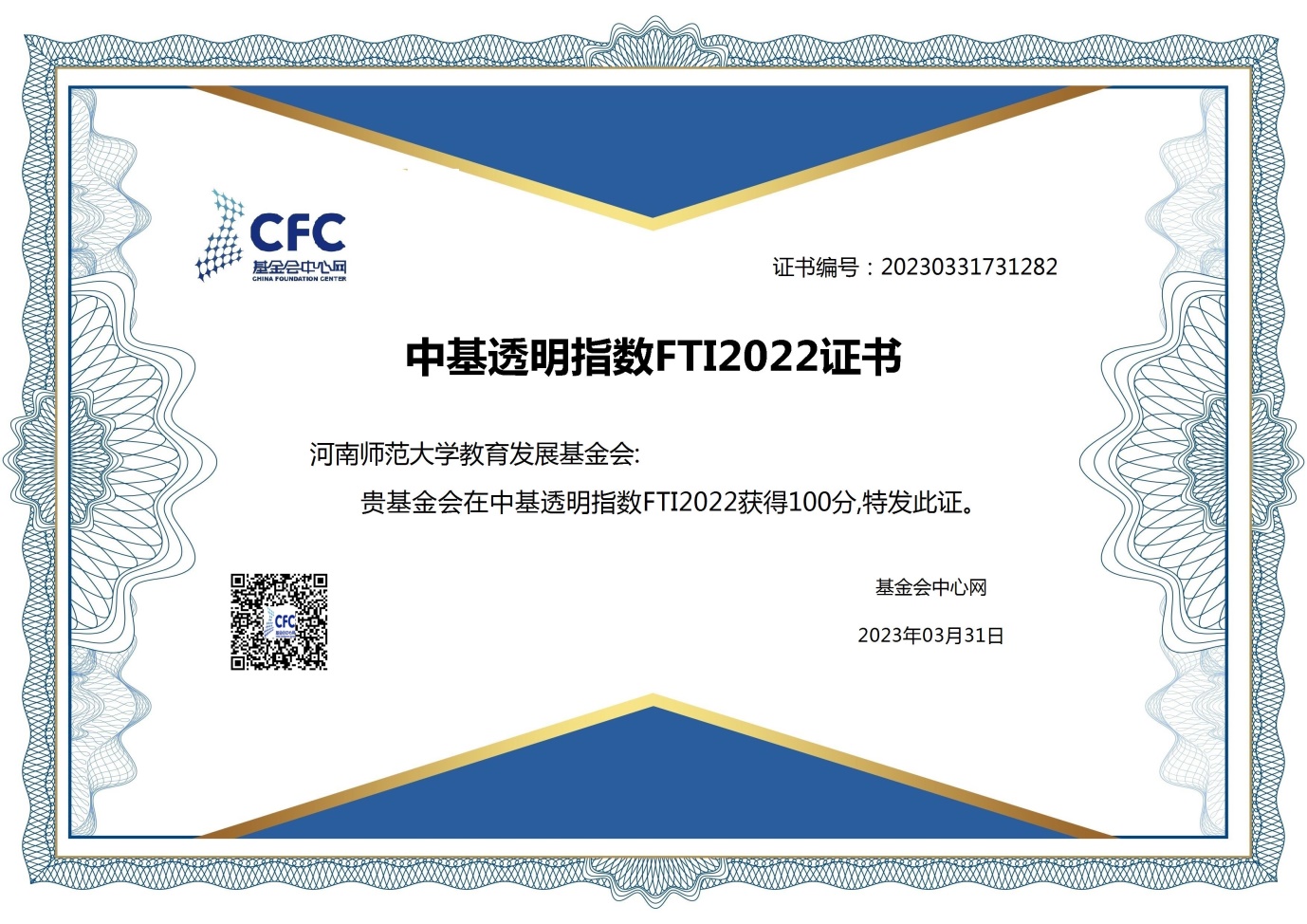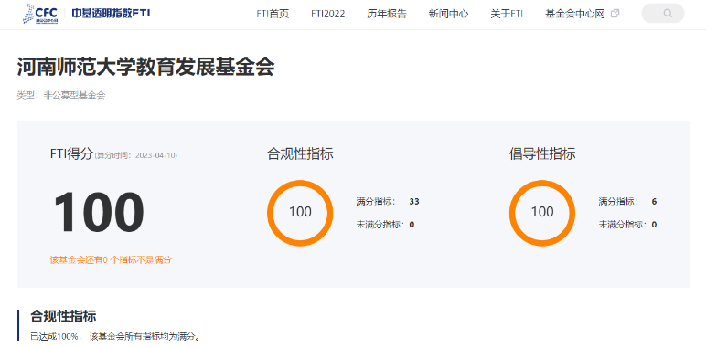 近日,从基金会中心网获悉,我校教育发展基金会在中基透明指数FTI2022获得满分(100分),并列全国第一名。