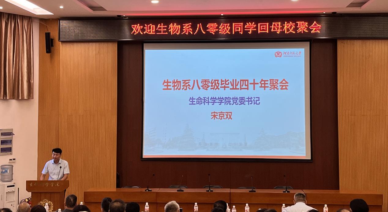 四十年同窗情深,四十年归来依旧。811上午生命科学学院1980级校友在生物报告厅举行毕业四十年师生聚会校党委常委、副校长聂国兴,生命科学学院党委书记宋京双,时任任课教师卢龙斗、张红绪、李庚全以及从国内外赶回母校的近90名校友参加此次聚会