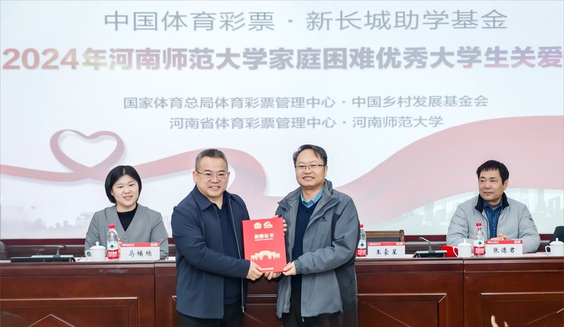 12月10日上午,我校在物理北楼三楼报告厅举行“中国体育彩票•新长城助学基金”资助仪式,校党委常委、副校长聂国兴出席仪式并讲话。河南省体育彩票管理中心副主任王豪星,中国乡村发展基金会助理主任马楠楠,新乡市体育局副局长张德君,河南省体育彩票管理中心新乡分中心主任陈全中,河南日报、中国体彩报等十余家媒体记者,学校党委学工部、校友与基金工作办公室负责人,各学院(部)党委副书记及2024级受助学生等参加仪式。仪式由党委学工部副部长蒋晋光主持。