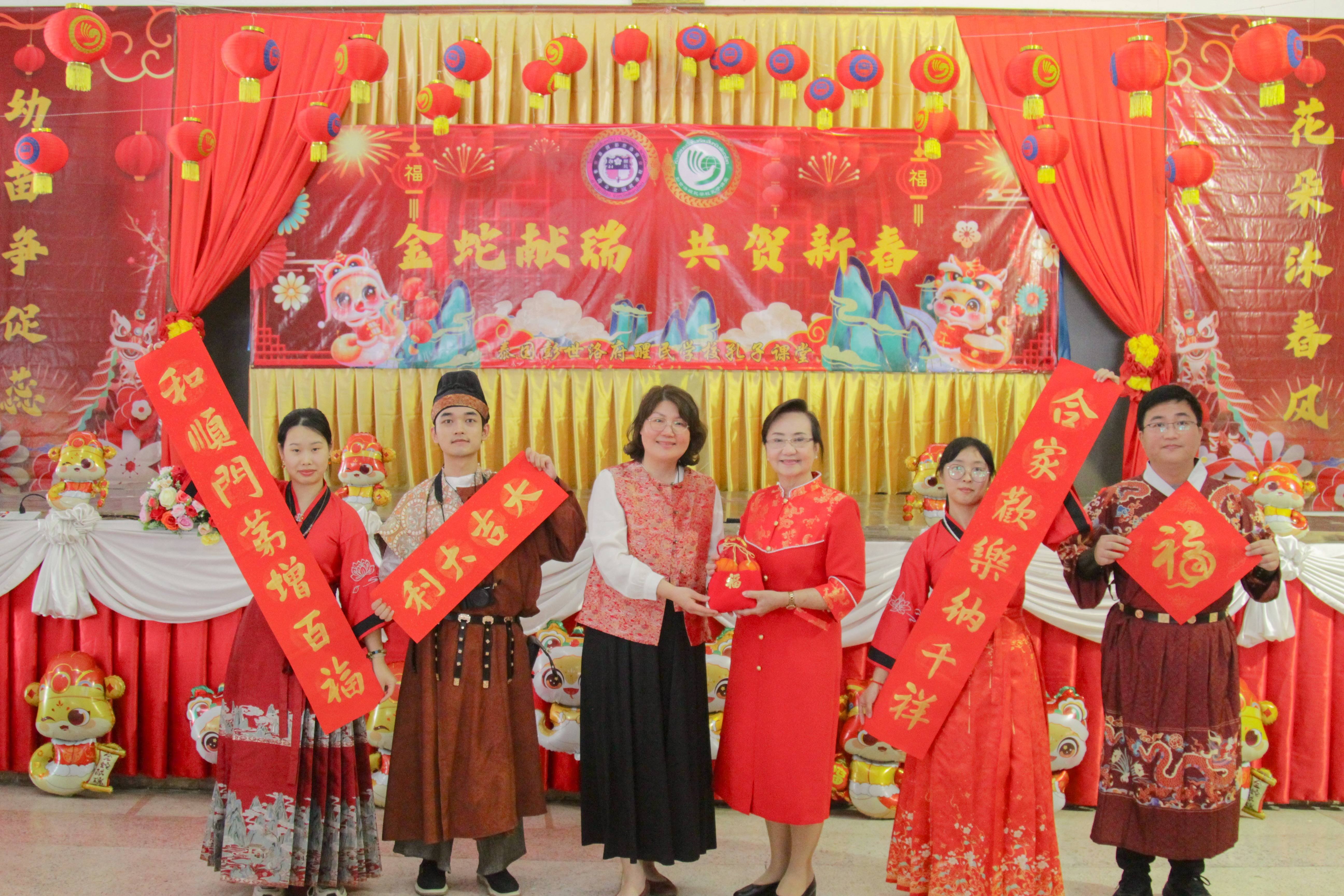 On January 28, the eve of the Chinese Spring Festival , the Confucius Classroom at Xingmin School Thailand held a Spring Festival gala themed “Gold Snake Brings Good Fortune, Celebrating the New Year.” The event was attended by Hou Yulan, Deputy Director of Xingmin School, Principal Huang Hanshi, Principal of the Chinese Department Hong Huijuan, as well as officials from HNU’s Office of International Cooperation and Exchange, the Chinese representatives of the Confucius Classroom, and nearly a thousand teachers and students, all dressed in festive attire to jointly celebrate the Year of the Snake.