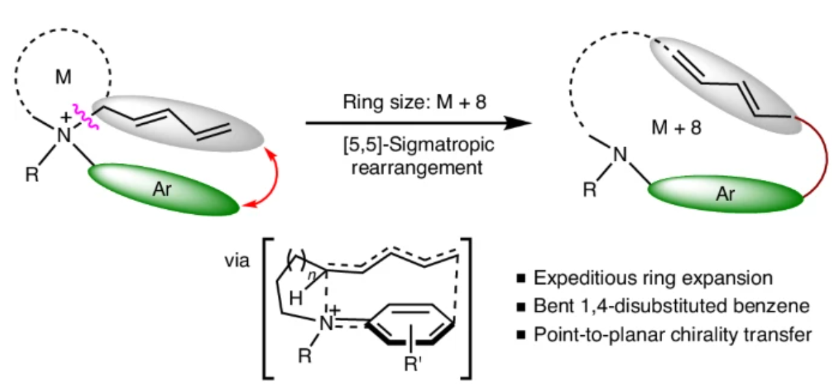 intermediates, an eight-atom ring expansion was achieved in one step, successfully constructing 1,4-disubstituted benzene ring units with significant angular distortion. This ring-expansion rearrangement strategy breaks through the bottleneck of traditional synthesis of highly strained para-cyclophanes and provides an efficient platform for constructing complex three-dimensional drug molecules.