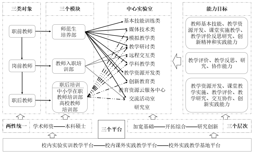 中心针对职前、入职、职后三类培养对象,设计了师范生培养部、教师入职培训部、中小学在职、高校教师培训部等三个模块,每个模块下设若干学科基础和教师教育实验室,培养了具有较高教师教育实践能力、科学素养和创新精神的高水平的优秀师资。