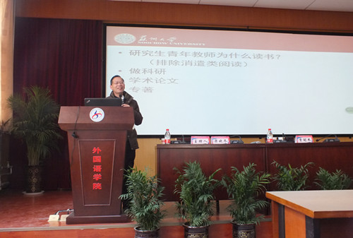 上午10时10分,苏州大学外国语学院贾冠杰教授应外国语学院邀请,在院学术报告厅作了题为《读书与科研》的学术讲座。讲座由外国语学院常务副院长梁晓冬教授主持。